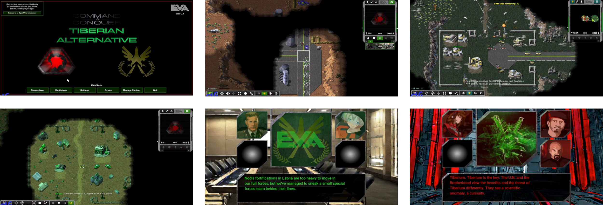 Tiberian Alternative is a mod primarily focused around a sprawling single-player campaign. TibAlt follows the events of Red Alert Alternative, which posed a hypothetical bridge between Red Alert and Tiberian Dawn following the Soviet victory path of Red Alert, wherein rebel forces reborn as the Allies are coopted by Kane and subsumed into the Brotherhood of Nod, while the Soviet Union plays a major role in establishing the anti-Nod European Defense Initiative, a precursor to GDI.
